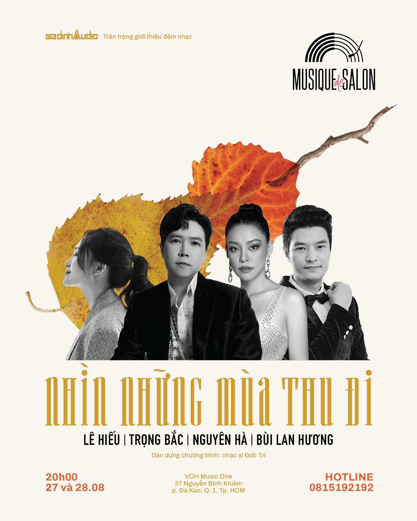 Musique de Salon hân hạnh được cùng quý vị về với mùa thu bằng những gam màu âm nhạc đẹp đẽ qua bàn tay dàn dựng chương trình của nhạc sĩ Đức Trí và ekip của chúng tôi. Vẫn trung thành với cách hoà âm mộc mạc sâu lắng, ban nhạc acoustic, chúng tôi hy vọng live show sẽ mang đến cho quý khán giả những giây phút thư giãn đúng nghĩa.